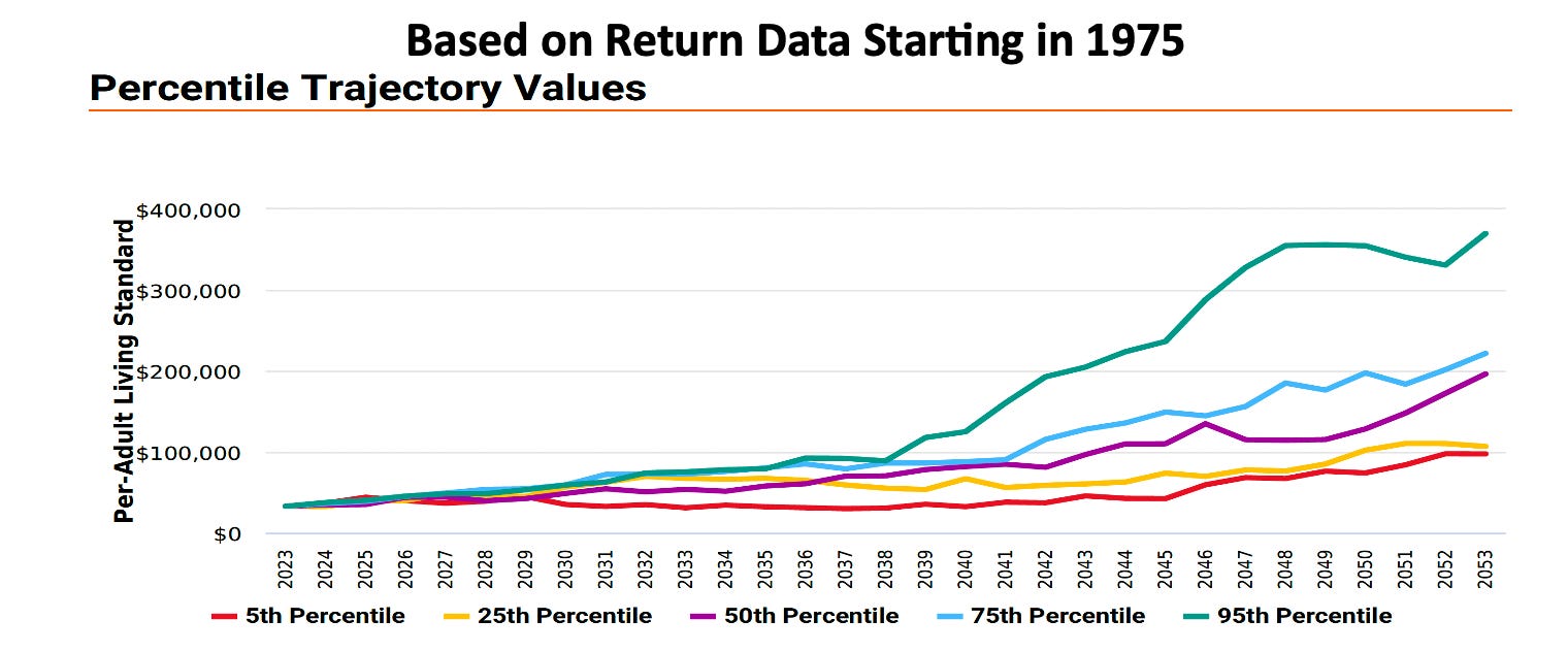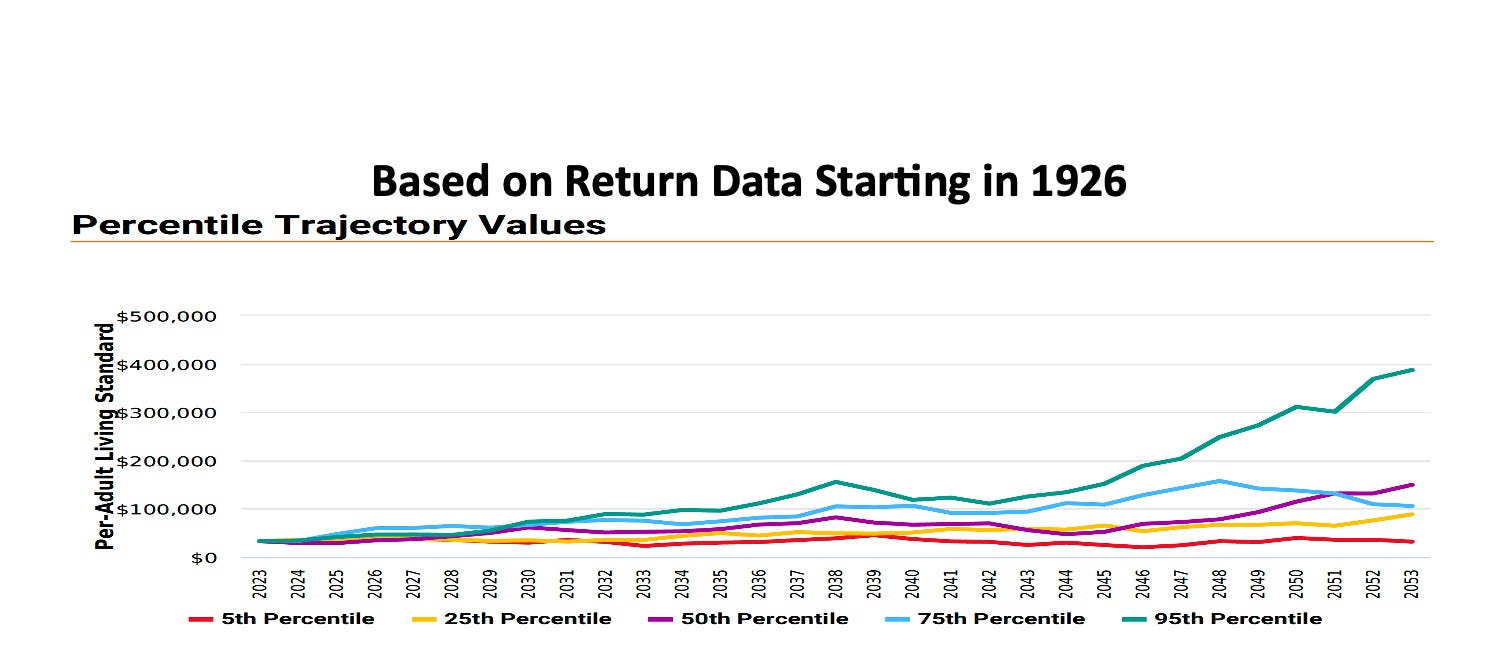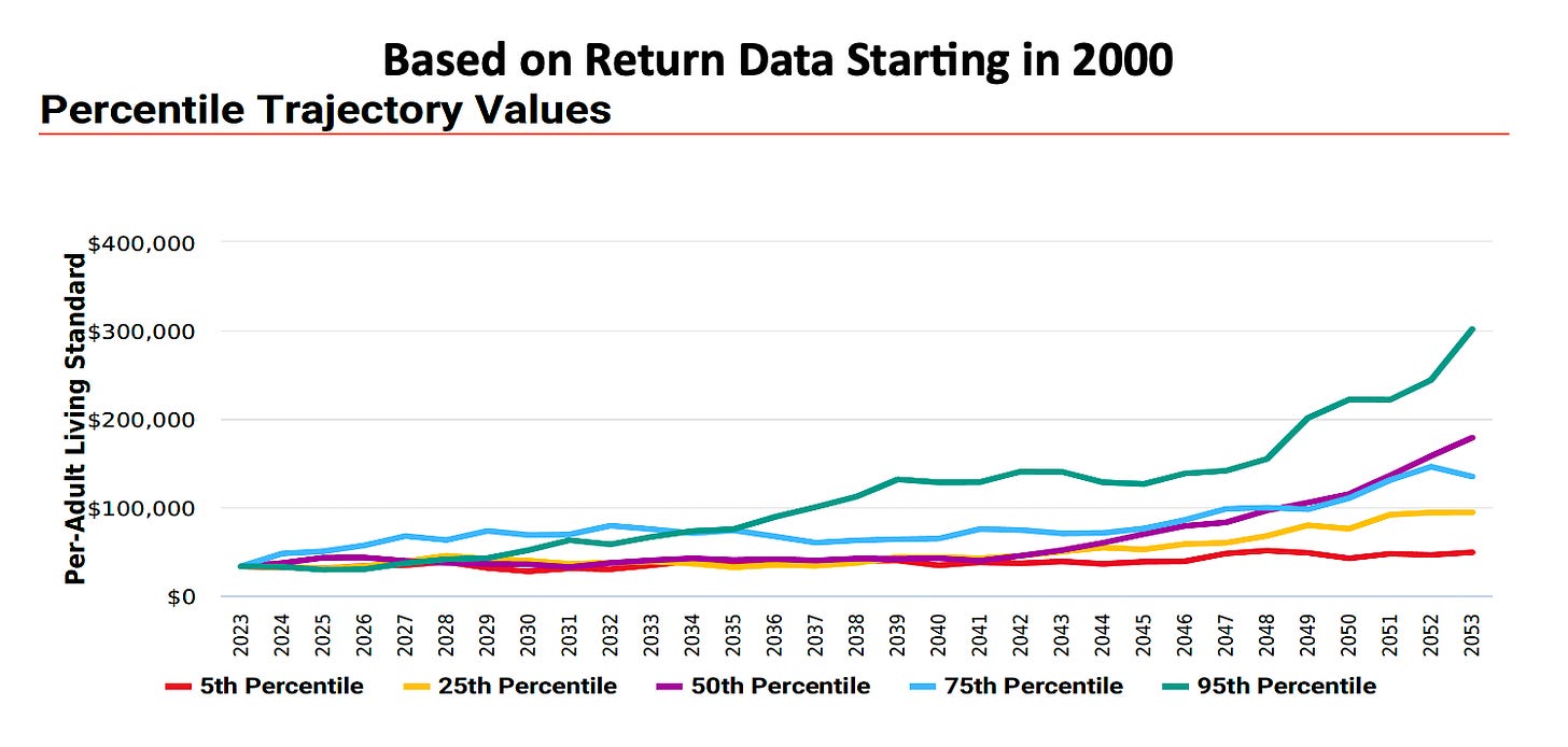 Were Planner A and Planner B to show Jane the degree of annual living-standard variability she was going to experience even along a 95th percentile trajectory, she surely wouldn’t agree to a 60-40 portfolio. This is the sense in which economics-based planning delivers the same message across all four very different return distributions. Indeed, Jane, like almost all low and middle-income households should be advised to do Upside Investing, producing a floor to her living standard while still enjoying the prospect of a decent upside down the rode.