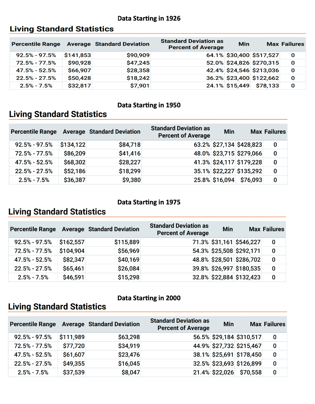 The first table shows that the distributions differ substantially. Which data-period one considers materially impacts the average return and standard deviation of the 60-40 portfolio. The figures show 5th, 25th, 50th, 75th, and 95th highest lifetime living standard trajectories across 500 MC simulations as ranked by their average annual values. And the final set of tables present living-standard trajectory statistics.