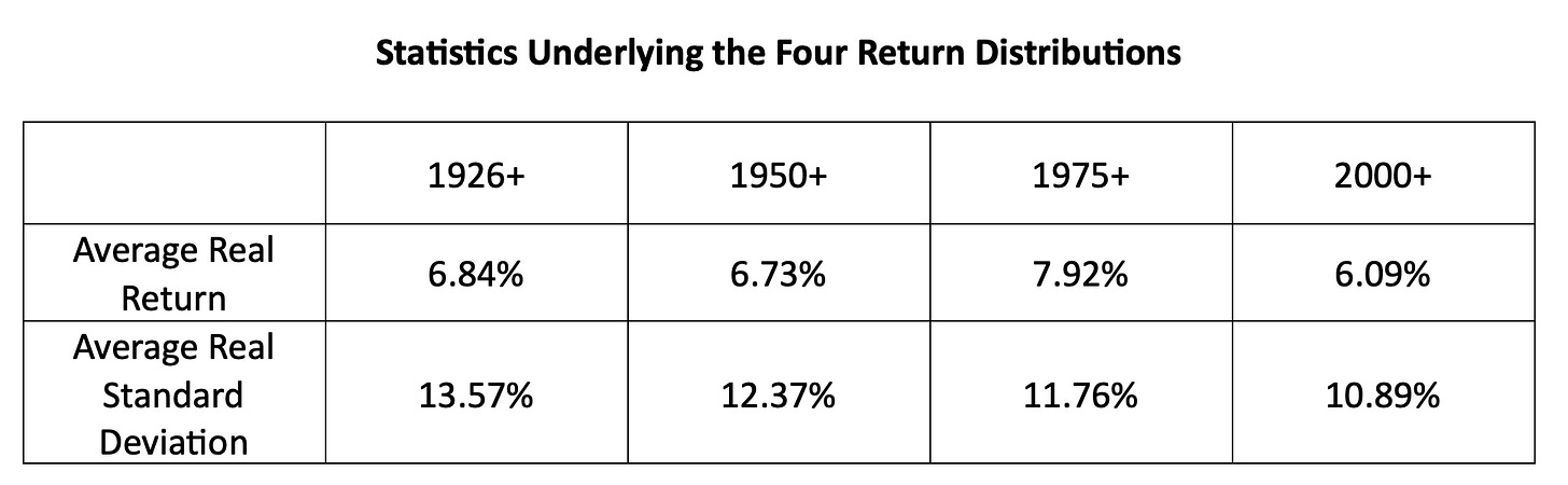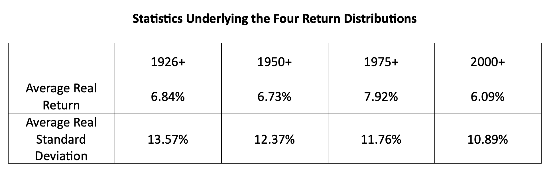 The figures and tables below examine MaxiFi’s Full Risk Investing’s sensitivity to return distribution assumptions. Each figure and table examines Jane’s living standard (her annual discretionary spending) assuming she invests 60-40 in stocks and corporate bonds. The underlying four return distributions are joint log normally distributed and calibrated based on data post 1926, post 1950, post 1975, and post 2000.