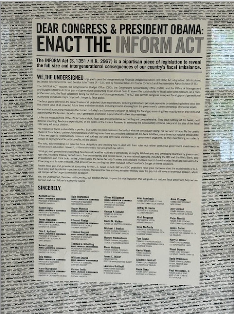 Thune and Kaine asked their Senate colleagues to co-sponsor the bill — the Intergenerational Financial Obligations Information Act — The INFORM Act. A paltry three Republicans and three Democrats agreed to do so – this despite a full-page ad in the NY Times, urging the bill’s adoption.