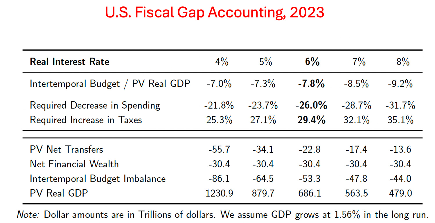 The U.S. fiscal gap is calculated as of 2023, i.e., it uses actual 2023 and 2024 data. But it incorporates the Congressional Budget Office’s extended budget forecast, which anticipated the “big and beautiful” budget bill recently passed by the House and likely to be passed by the Senate. It also includes the CBO’s estimate of future tariff revenue. Hence, it provides our best picture of the prevailing U.S. fiscal gap as of today.