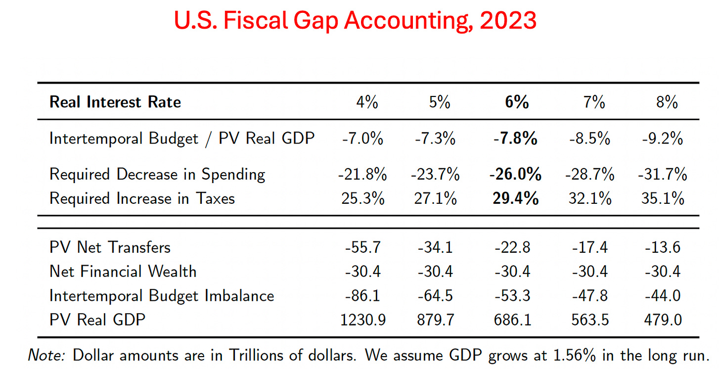 As the table indicates, the U.S. fiscal gap ranges from 7 to 9.2 percent of annual GDP as the discount rate rises from 4 percent to 8 percent. Yes, the fiscal gap is sensitive to this assumption. But even the lowest value — a 7 percent fiscal gap — is astronomical. Eliminating a 7 percent fiscal gap requires an immediate and permanent 21.8 percent cut in all federal spending apart from interest on official debt. This figure jumps to 26.0 percent and 31.7 percent assuming 6 percent and 8 percent discount rates, respectively. As for immediate and permanent increases in taxes, the requisite hikes are 25.3 percent, 29.4 percent, and 35.1 percent assuming 4 percent, 6 percent, and 8 percent discount rates, respectively.