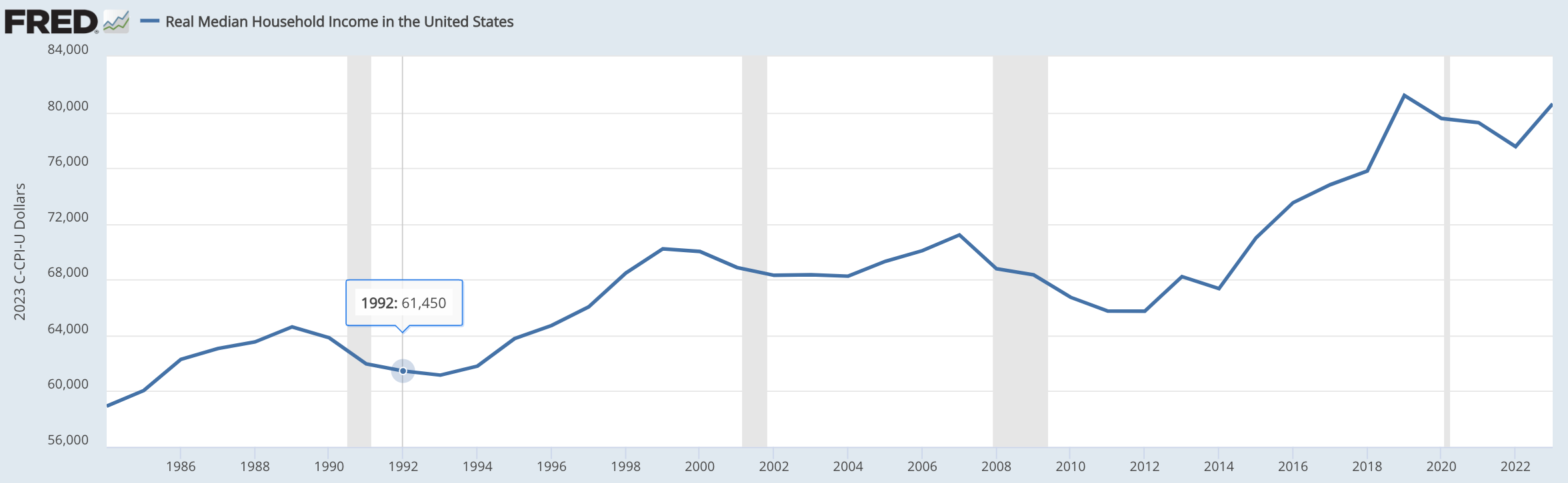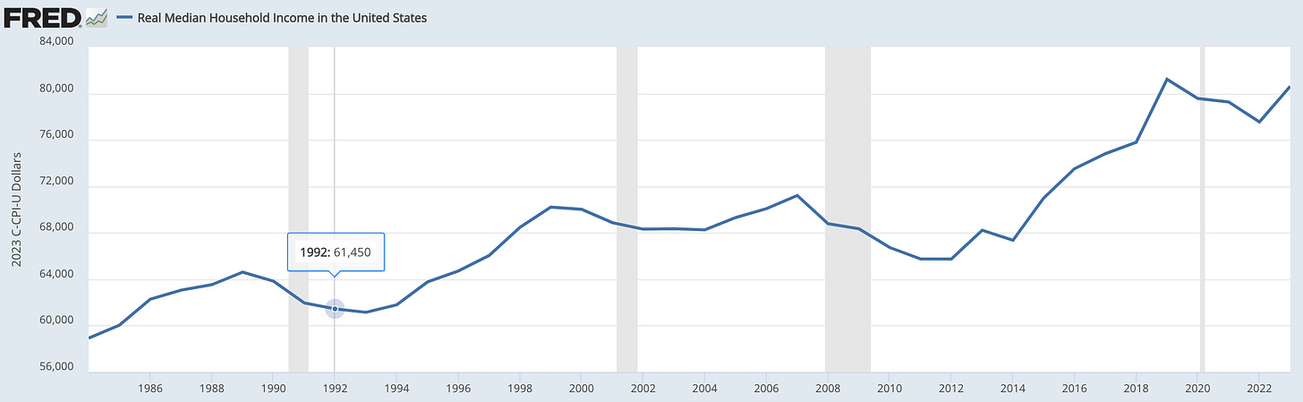 Yes, the economy was in the dumps in 1992. (See the chart below.) Median real household income had declined by 5 percent since Bush, the First, took office. But Clinton won only 43 percent of the vote. Ross Perot ran an off-again, on-again third-party campaign but still captured a massive 19 percent of the popular vote. Observers differ about Perot’s election impact, but having two people gang up on GH was likely decisive.