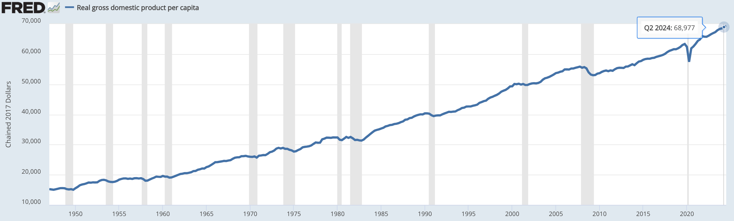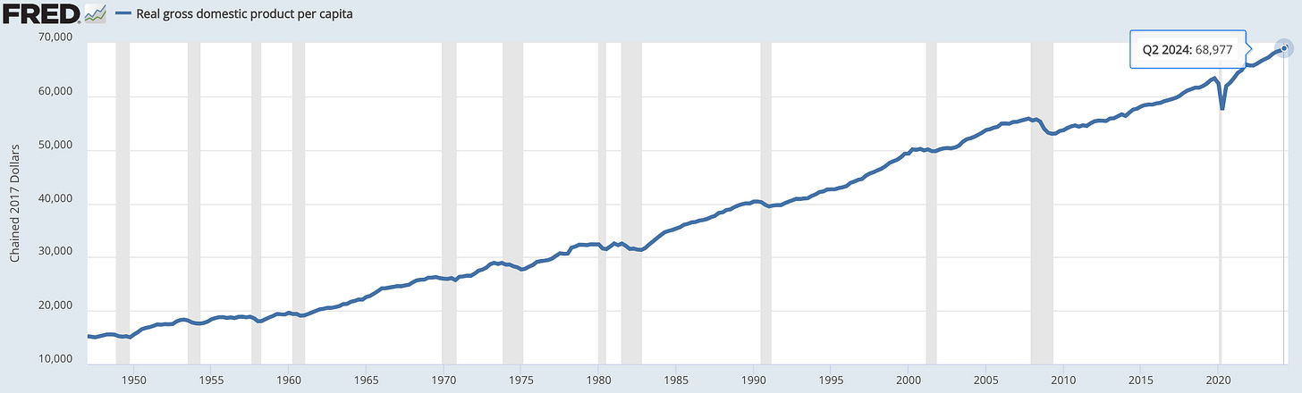 Take a look at the chart below of real GDP per capita. Apart from COVID, per capita GDP — every country’s basic living-standard measure — rose during both the Trump and Biden administrations at roughly the same 1.8 percent annual rate.