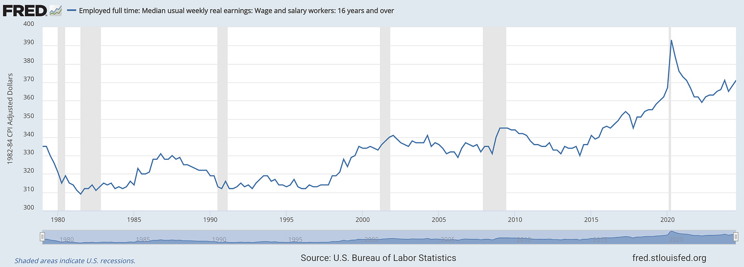 Harris could have made inequality her major focus. All she needed to do was put the above chart side-by-side with the chart below. It shows that median weekly real earnings have risen by only 10 percent over the past 45 years!