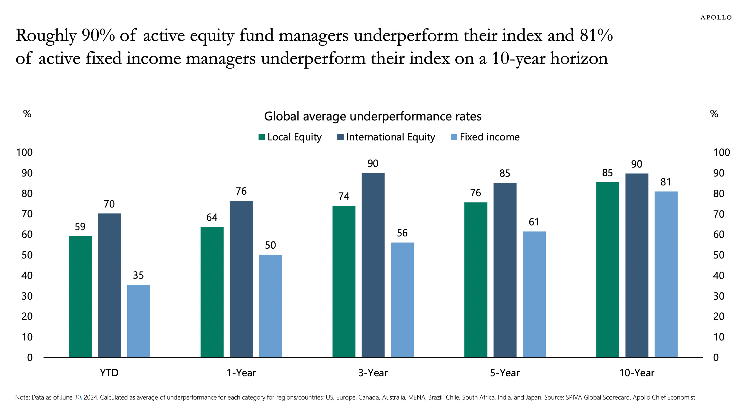 The chart considers the performance of domestic equity, foreign equity, and fixed income active-fund managers throughout the financial world. The findings for U.S. managers are little different. Take U.S. active equity fund managers. Year to date, over half — 57 percent — underperformed the S&P 500. Over the past five years, 77 percent underperformed the market. And over the past decade, 85 percent missed the mark.