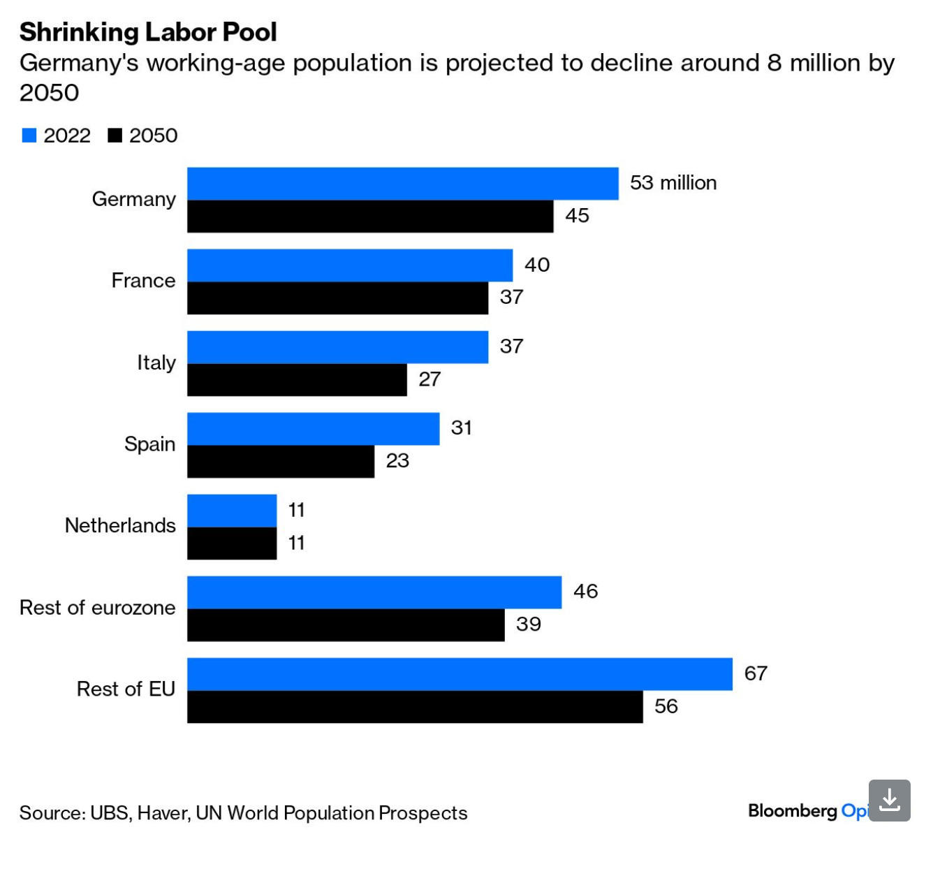 Germany currently has 46 million workers out of 53 million people of working age. How many workers will Germany have in 2050?